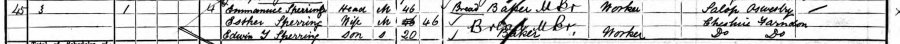 Emmanuel Sperring (shown on the 1901 census below) came from Oswestry and married Esther Thomas, daughter of a Farndon carter, in 1878. Two of Esther's brothers were already working as baker's apprentices for Harrison, William Thomas actually living on the High Street premises. Emmanuel was already a baker by the time of his marriage, and was probably employed by Harrison, leading to him meeting Esther through her brothers.