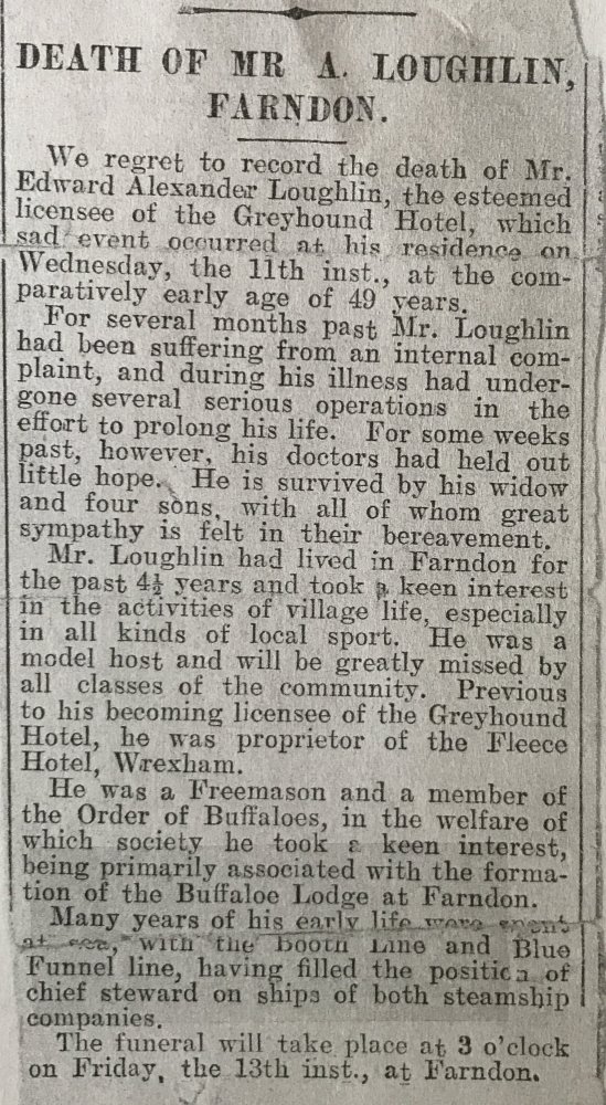 In 1929 Edward Alexander Loughlin took over the tenancy. Born in Liverpool, Edward was a seafaring man spending many years in the Merchant Navy working as Chief Steward for Booth Line and Blue Funnel. He was also deployed on the convoys during WW1 and was awarded the Mercantile Marine Medal and the British War Medal. Coming ashore he had taken on the tenancy of the Fleece Hotel in 22 Hope Street in the centre of Wrexham with his wife Isabella, before moving to Farndon, with their sons Edward, Leslie Joseph and Colin. Their sons had been well educated, having attended Merchant Taylor's school in Crosby, followed by Grove Grammar School on their move to Wrexham.