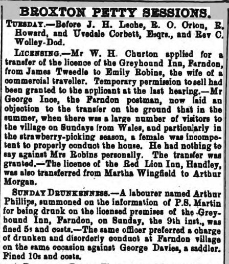 In 1827, the licence was held by George Dutton, who also owned the pub as well as the land. He died in September 1837 and it was inherited by his son Richard, but as he was too young to run the pub, the licence was granted to Thomas Clarke, shown by the Tithe Award and census of 1841. Clarke held it until the arrival of Thomas Townsend (c.1851) who worked as a joiner, and farmer of the Greyhound land to supplement his income. He was followed by Abraham Thomas (1874), John Lea (1881) and Matthew Barrow (1891), by which time it was tied to Chester Northgate Brewery, and offered eight letting bedrooms. Drunken behaviour occurs in every hostelry at some time or another, but it was becoming so bad in Farndon that local asizzes were kept busy. One of the causes was the different licencing laws either side of the England/Wales border higlighted in this particular case;
