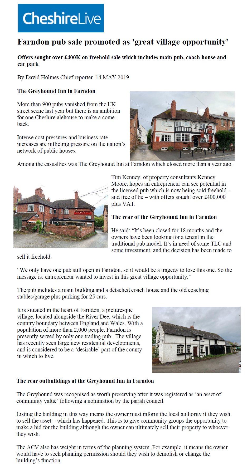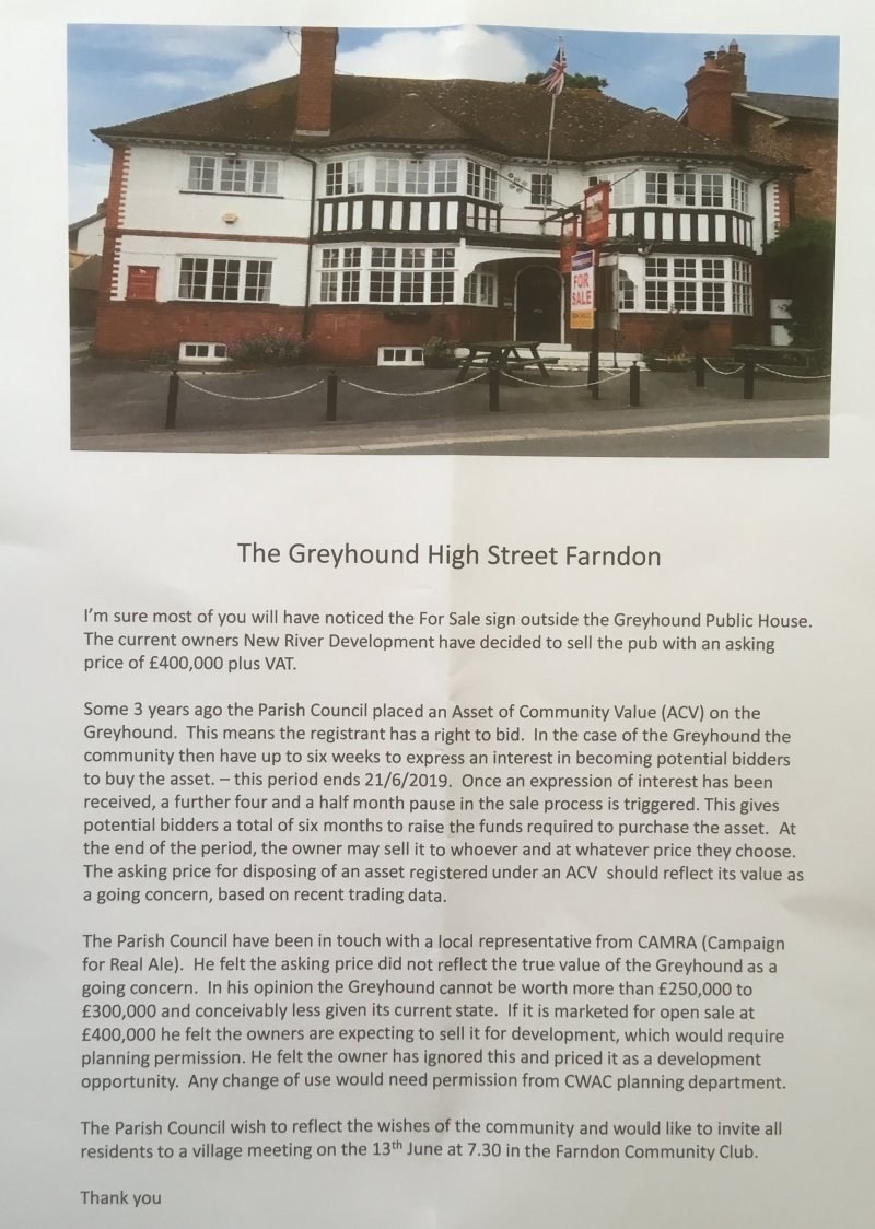 The stern warning indirectly conveyed in the jocular description which appeared a few weeks ago, of the despatch of the Farndon Fire Brigade to a fire has been unfortunately disregarded. Events succeed each other so rapidly in this up-to-date village that we have no time to concentrate our energies on any work which may not be required until tomorrow. We argue that as such-a-thing did not happen last week, it will therefore not happen this, and we pride ourselves upon our logic, for we know "summat in Farn." Moreover, as we are Christian, we do not believe in the Goddess Chance, and certainly did not expect to be served such a mean trick as the one played upon us in the early hours of Thursday morning. Just after four o'clock the alarm was given that the Greyhound Hotel was on fire. The proprietress (Mrs Fleet) was awakened by the smell of burning, and rising hurriedly she awakened the household and summoned the Fire Brigade. The members instantly responded to the call, and had their engine on the scene in a very creditable time. All their efforts were, however, nullified by the fact that the hose was so defective that it would not even carry the water as far as the nozzle. It was like the Irishman's pocket that would not hold money, it was so full of holes, leaks and rents. Meanwhile, the fire obtained the mastery, and for two hours raged furiously. There was a high wind blowing at the time right through the village, and along the main street there was carried a veritable stream of living fire, threatening to set alight the whole place. Sparks and balls of fire were falling on root and on stack, and the utmost vigilance and activity were required to keep the huge Dutch bays and the inflammable contents (in the centre of the village) from becoming ignited. It was a time of great anxiety, and had the wind veered but a few points nothing could have saved the village from destruction. The Wrexham Fire Brigade arrived just as the next house caught fire, but they speedily diminished the danger, and finally succeeded in completely extinguishing the flames. Unfortunately, the Greyhound Inn itself is completely gutted, and presents a terrible spectacle. The members of the house lost all their personal belongings, as well as their cherished possessions, while very little furniture was rescued. The origin of the fire is a mystery, and it seems to have obtained a firm hold before it was discovered. To some extent, the loss is covered by insurance. Great sympathy is felt in the village both for Mrs Fleet and her son, more especially as it is felt that had the Farndon engine been in working order their loss would not have been so great. It is to be hoped that something will now be done in the matter. As it stands, the brigade is worse than useless, for it leads people into a false security. The question to first settle is whether there shall be an engine at Farndon or not. If there is not sufficient public spirit in Holt and Farndon to keep the thing in good order, then why not sell the engine and openly admit the failure? We should know how we stood, and those of us who dread a fire could take what steps we might think best. At all events, we should cease to trust what has now become a public danger.
