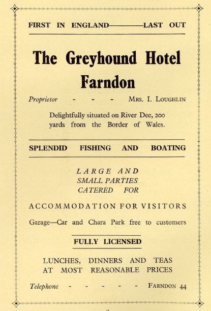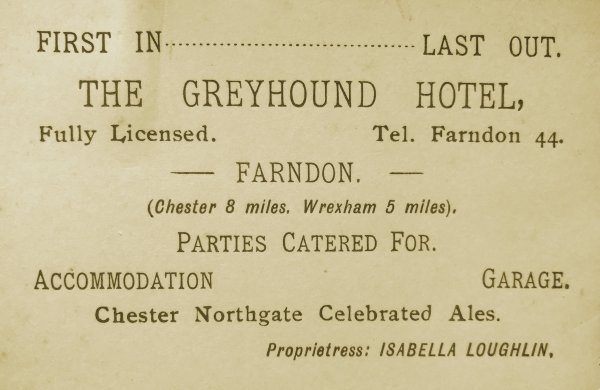 Their stay was a short one, as by 1914 the landlord was George Edward Chesterman. His tenancy coincided with the outbreak of war and the introduction of emergency measures by the government, under the Defence of the Realm Act (DORA). Powers were wide ranging; in addition to matters of homeland security and programmes to increase industrial and military production, opening hours for pubs were cut, beer was watered down - all designed to improve the work ethic. A 'non-treating order' was even introduced,to discourage patrons from buying rounds for fellow drinkers in an attempt to reduce consumption. The latter was taken very seriously and local watering holes came under scrutiny. So much so, that in Farndon, a couple of policemen working undercover, posed as anglers calling in to the High Street pubs for refreshment after a supposed day on the Dee. As a result of their visit, the licencee of the Greyhound was arrested and brought to court on 25 July 1916, for serving a patron with four bottles of beer for his pals in the back room of the pub. If they had bought them individually no law would have been broken, but the hapless landlord, Mr Chesterman, found himself up before the beak at Broxton Petty Sessions, prosecuted under the Liquor Control Board Order “for selling intoxicating liquor (beer) for consumption on the premises, such beer not being ordered and paid for by the persons so supplied”. The four customers who consumed the beer, all Wrexham men, were alongside him, also charged.