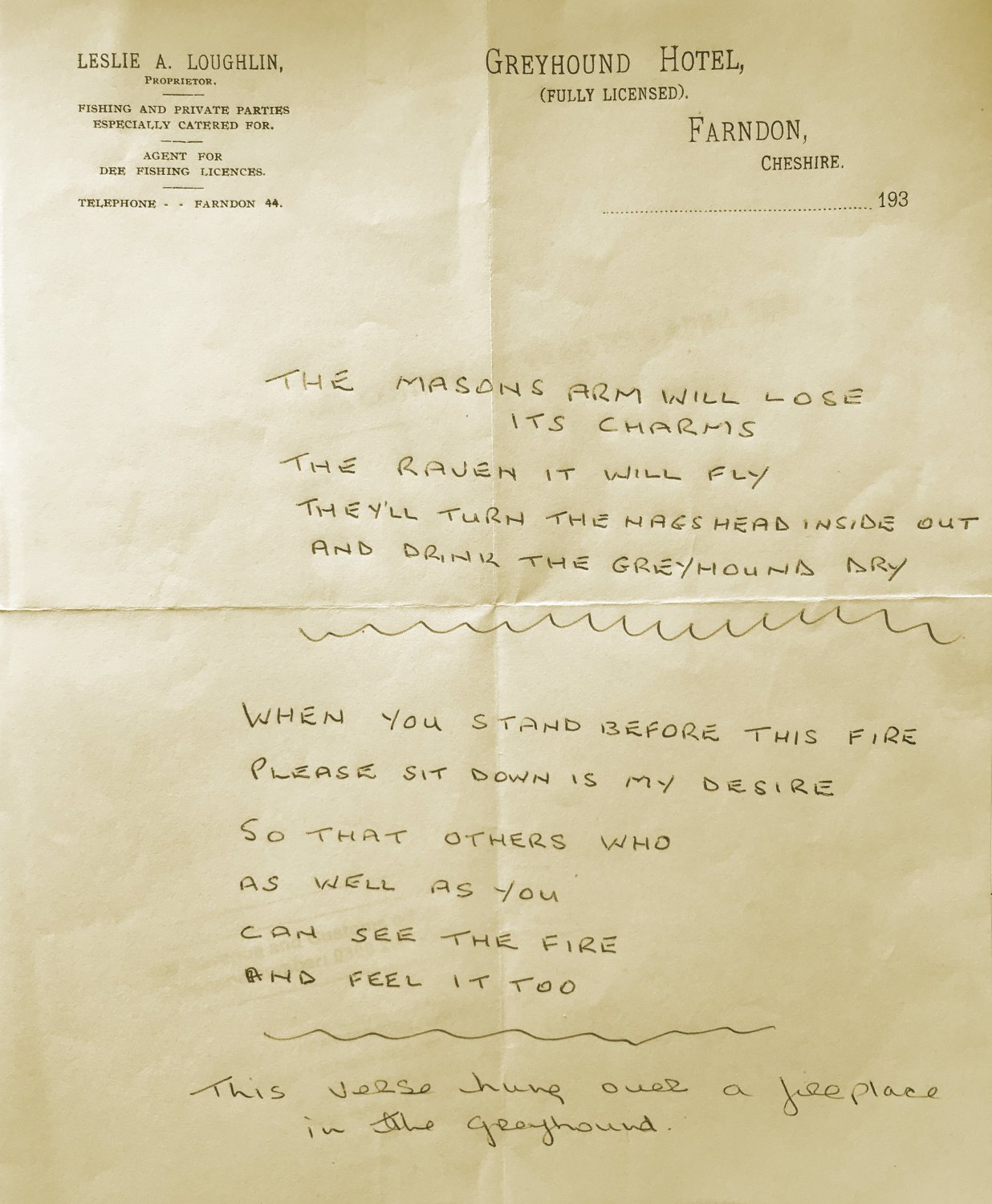 'The Masons Arms will lose its charms, The Raven it will fly, We'll turn the Greyhound upside down, And drink the Nags Head dry'. |