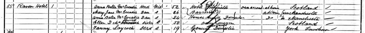 Note that Mary Jane has entered 'daughter' rather than 'Head'. The date of the census was Sunday 2 April 1911. Her mother, Anna Bella McCreadie, had passed away only two weeks earlier on 16 Mar 1911. Understandably they had not quite come to terms with her death, and what the future held for their tenancy in The Raven.
