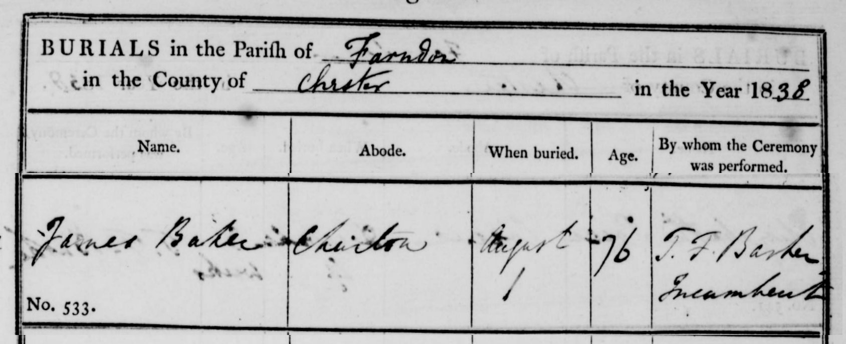 This is the last Will and Testament of me, Moses Baker, Beer Seller, of Churton by Aldford in the County of Chester. I give, devise, and bequeath, all the real and personal estate of which I shall be possessed or entitled at the time of my decease unto my dear wife for the term of her natural life. Afterwards to my nephew John Parker, Farmer of Highfields, Coddington, in the County of Chester absolutely. And I appoint the said John Parker my sole Executor of this my Will.