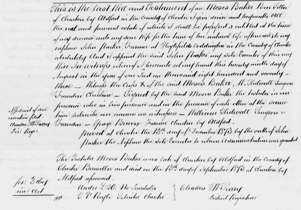 The Testator Moses Baker was late of Churton by Aldford in the County of Chester Beerseller and died on the 13th day of September 1873 at Churton by Aldford aforesaid.
