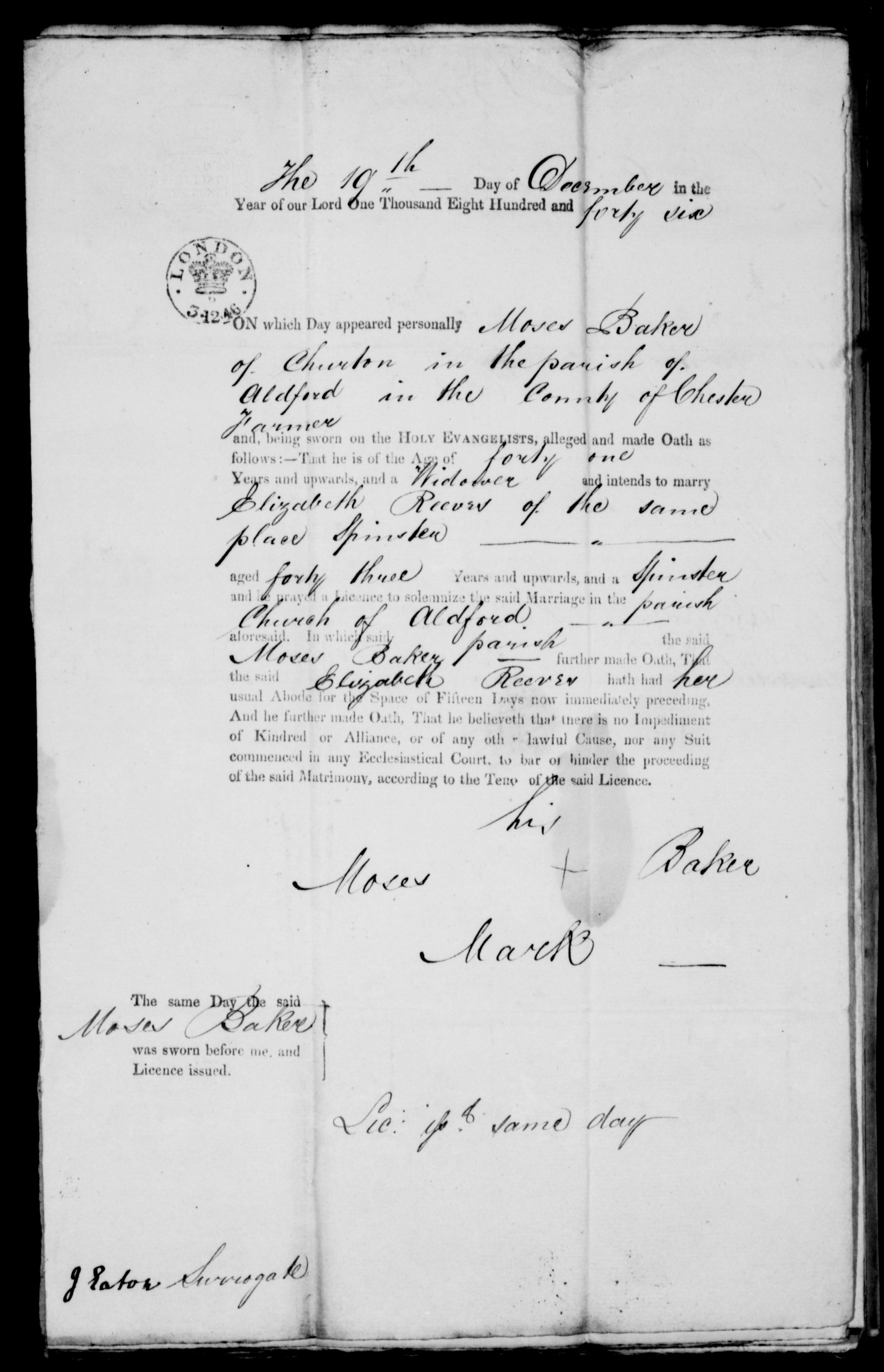 Witness the cross X of the said Moses Baker. W. Thelwall, Surgeon of Farndon, Cheshire