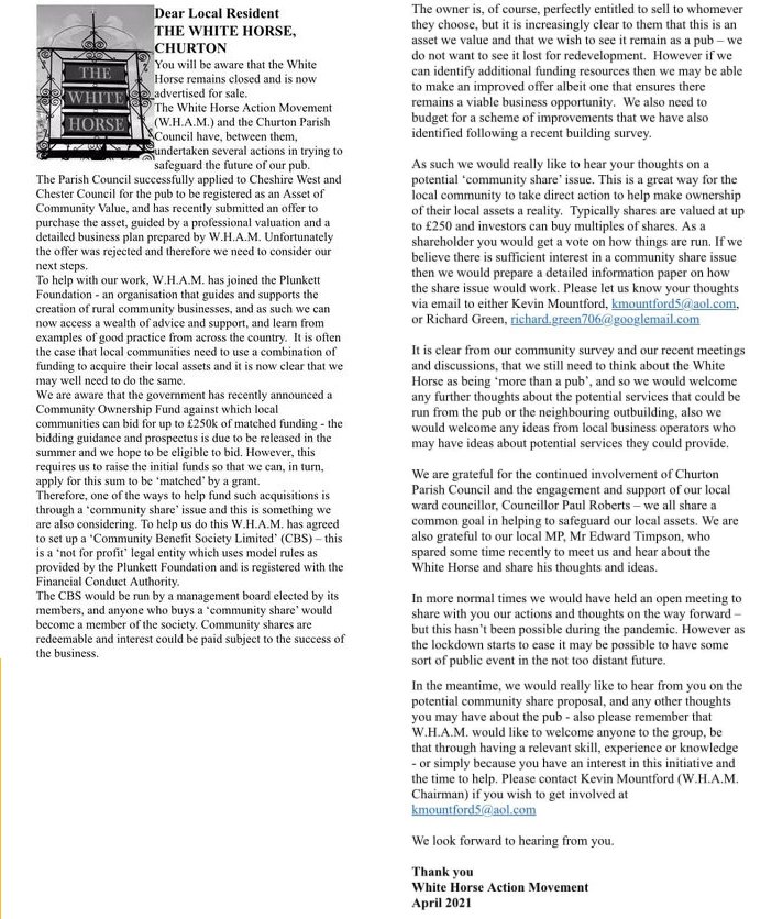 The Parish Council has been notified by CWAC of Admiral Taverns intention to sell the White Horse, and that under the Asset of Community Value legislation there is an Interim Moratorium, until the 13th August 2020, allowing the village to come back with any initial interest in taking on and operating the premises. We can also state that the PC is in consultation with WHAM, and will update further in due course, via both Facebook and the forthcoming Newsletter. But if, in the first instance, there are any expressions of interest, contact should be made through the PC. churtonparishclerk@hotmail.co.uk