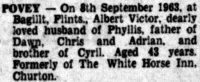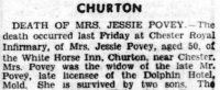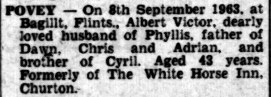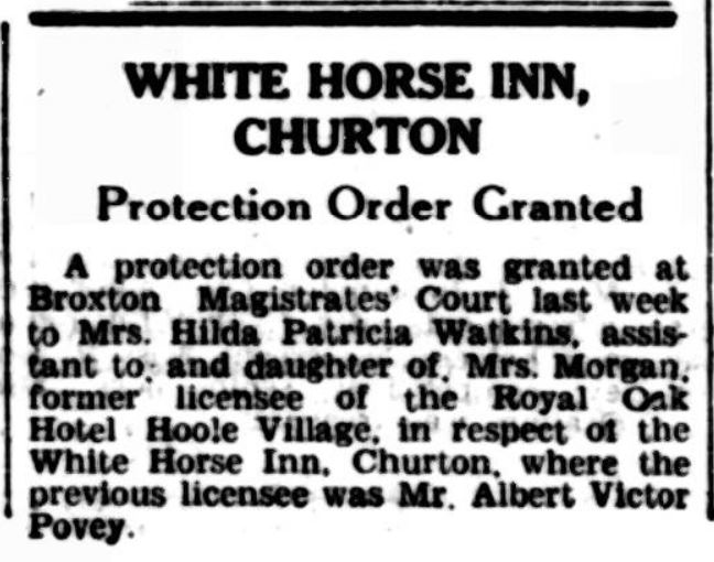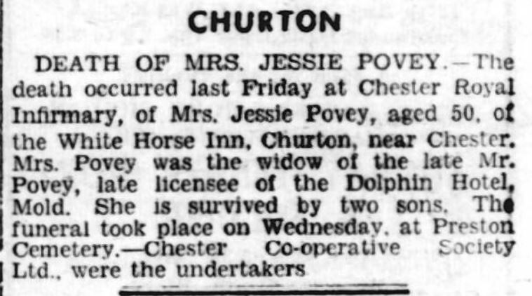 On his retirement, Albert and Jessie Povey moved to Mold, where they took on the tenancy of the Grade II listed Dolphin Hotel. Sadly, their stay was to be a short one, as Albert passed away on 28 October 1943 in Chester Royal Infirmary. Jessie decided to stay in the pub trade and moved to Churton to take on the White Horse. However, her stay was to be short here too, as she passed away on 17 August 1945, also in the Chester Royal Infirmary.