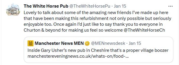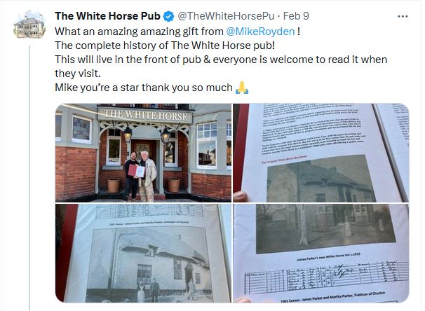 Finally, on 2 February 2023, Gary Usher went online to announce the opening of The White Horse on 3 March, which would be proceeded by a launch party for all those who supported the funding appeal and all involved in the refurb work.