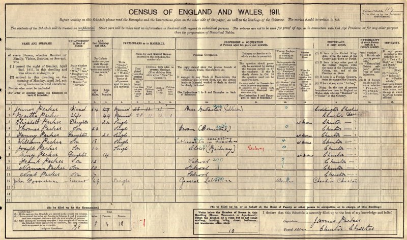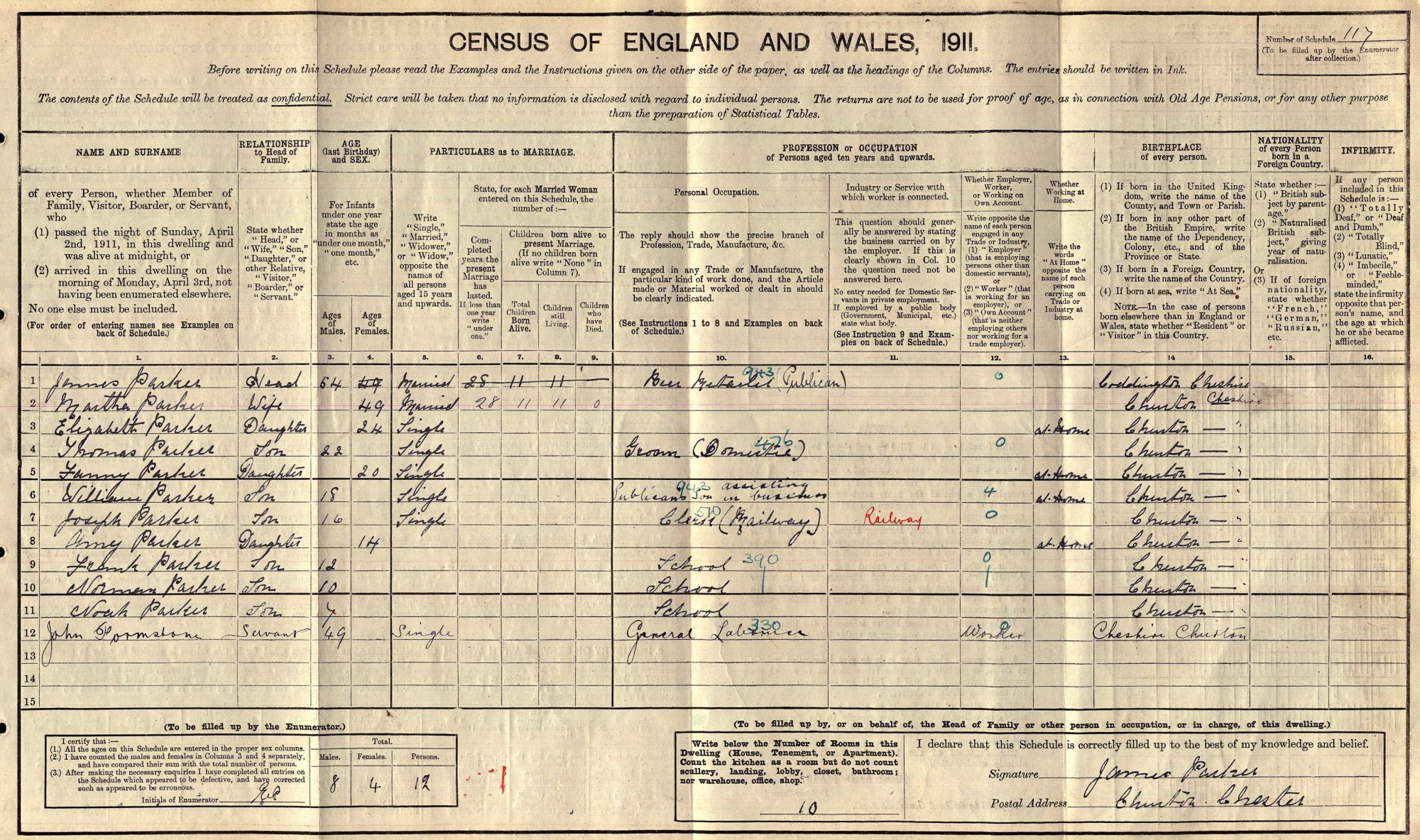 1911 Census - James Parker and Martha Parker, Beer retailer (Publican) of Churton