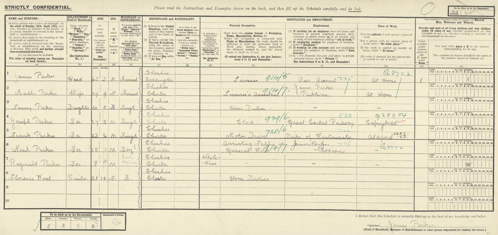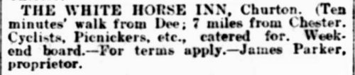 In 1921 James’ son Frank Parker was working as a Motor Driver for the Duke of Westminster, possibly as a chauffeur. He married later that year and by 1939 was living with his wife Florence in Upton Heath and working as a gardener.