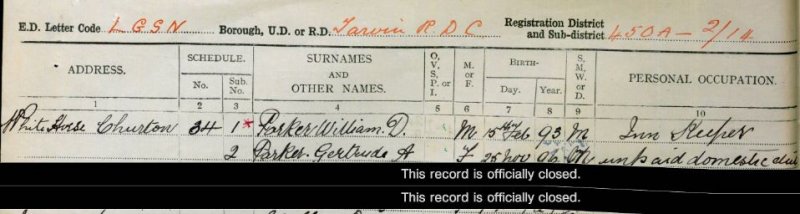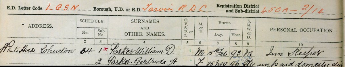 1939 Census - William David and Gertrude Parker, Innkeeper, White Horse, Churton