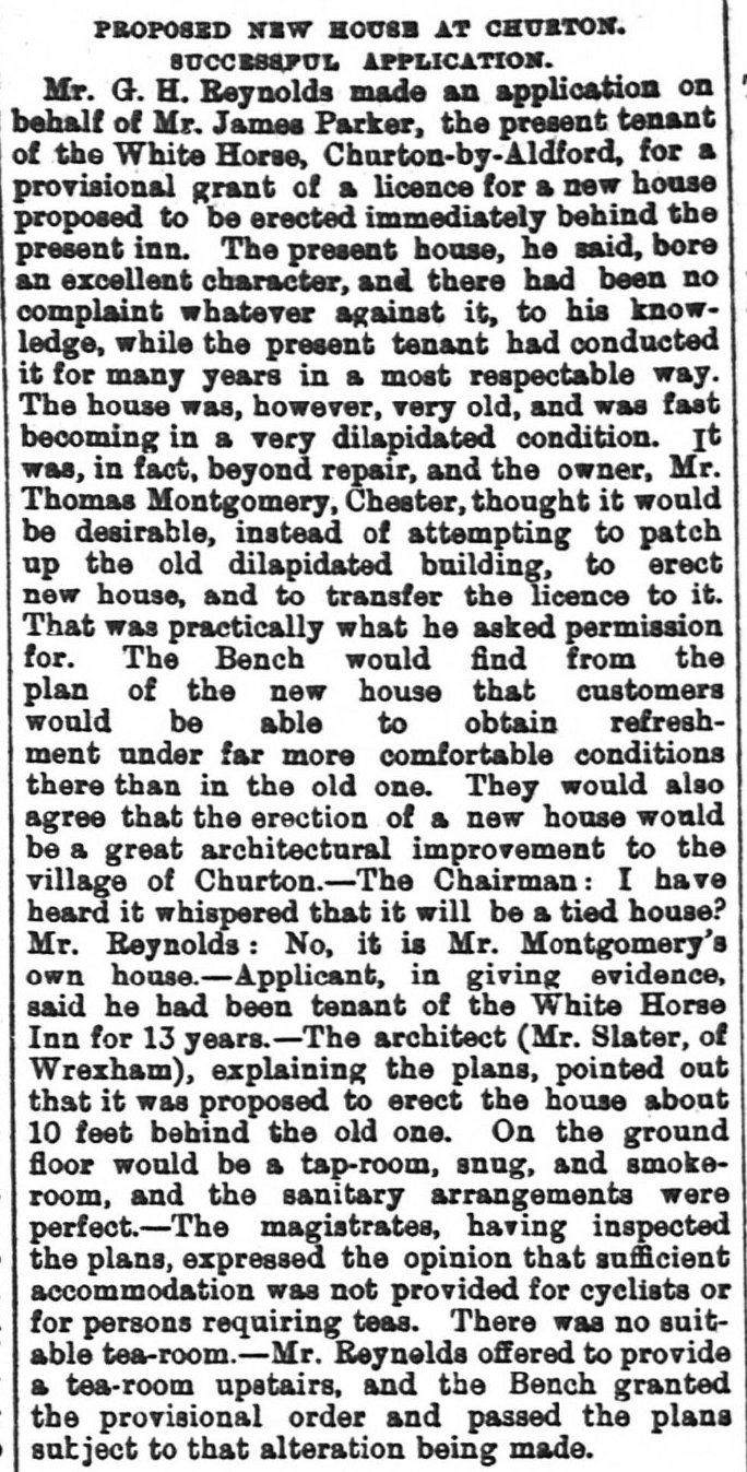 James Parker's application for a new White Horse Inn, Cheshire Observer, 2 September 1899