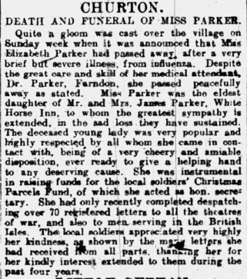 No sooner had the war ended, when the Parker family were hit with the tragic passing of daughter and sister Elizabeth, aged only thirty-two. She had fallen victim to the so called 'Spanish Flu', the killer pandemic sweeping across Europe in the aftermath of the conflict.