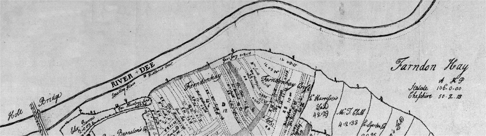 Click to enlarge. This is an extract from the 1735 esatate map showin the riverside fields (Farndon Hey) used for the race.