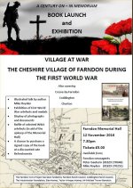On 12 November 2016, Farndon Memorial Hall hosted the official book launch of Village at War. A fitting venue, considering it was erected in memory of the Farndon men who did not return a century ago, all of whom have their biographies included in the book. The evening began with an illustrated talk by author Mike Royden, while during the interval and afterwards there was a chance to view the excellent and fascinating exhibition of WW1 artefacts and photographic displays of the village and soldiers, followed by a raffle of various WW1 memorabilia and refreshments.