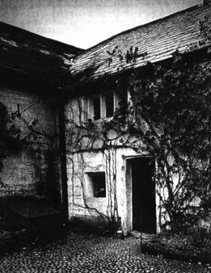In the Monk's Dwelling was a centre window. The two original doors surmounted by their massive stone lintels had been built up, and another doorway within recent years had been made between them. Dripstones had been carried over the doors and mullioned windows placed across almost the entire front of the building. The construction of the upper floor was similar to that of the barns and granary. The loft above and the ceiling of the open cartway at the eastern end of the main building were formed entirely of oak saplings roughly split with an axe and firmly cemented together with wattle- and-daub. At the south end of the eastern wing (which was demolished in 1913) was a fine, five light mullioned window, and the barns forming both wings were studded with embrasures, narrowing to a mere slit on the outer sides of their massive walls. There was evidence that the Barns had been shortened on the construction of Aigburth Hall Road in 1820-22. It was also apparent that several of the doorways had been built up over the course of years, the principal one having been at the top of the stone steps and at right angles to the original door.