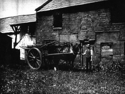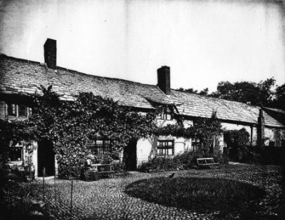 '...One glance at these old buildings is quite sufficient to impress the observer with their great age. The walls are built entirely of red sandstone,(15) each stone passing right through the wall to a depth of two feet. No mortar has been used, the stones being simply cemented together with red clay. A peculiarity of the architecture is the huge stones over the heads of the mullioned windows. The beams of the roof, which were once thatched, are all solid oak, worm-eaten and worn, but still as hard as iron, and have all been roughly shaped with an axe. Rough plates of oak are laid along the tops of the walls and to these are attached the oaken rafters; not a nail has been used, but the whole structure is compactly fastened together by means of oak pegs. Through one of the barns the open cartway runs. The ceiling of the passage is formed of young oak saplings split with an axe and covered over with a composition of red clay and chopped straw...'(16)