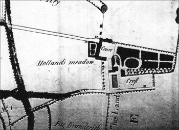 (left) Stanlawe Grange/Aigburth Hall 1845: Plan of Stanlawe Grange included within the Garston Tithe map of 1845. The map shows the 'c' plan of the Grange buildings and Aigburth Hall. The track that previously emerged from the monk's dwelling is now shown as a hedge/field boundary. The road at the bottom is Aigburth Road. (Liverpool Record Office).