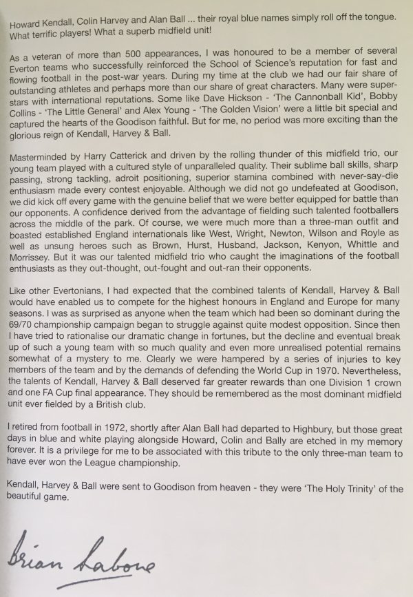 | On 3 May 2019, Everton unveiled their new statue commemorating the Holy Trinity – Howard Kendall, Alan Ball and Colin Harvey – outside Goodison Park, immediately prior to the last game of the 2018/19 season against Burnley.